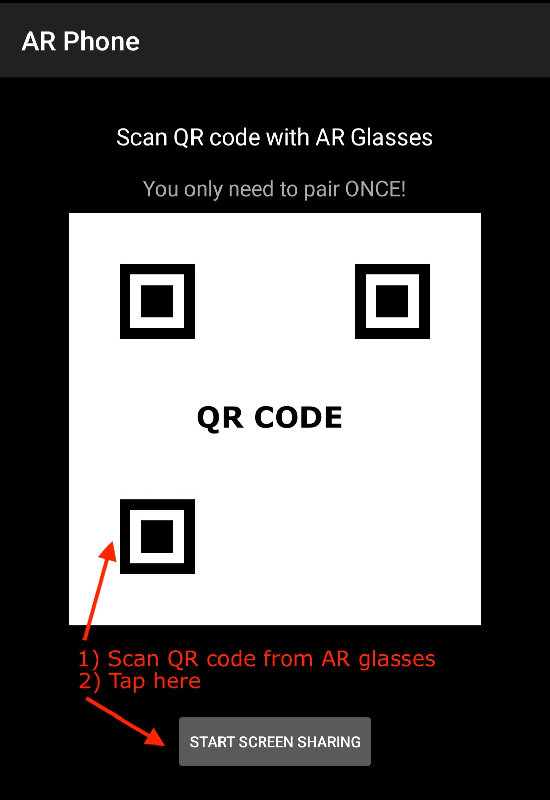 This will start QR code scanner, aim AR glasses camera at your phone and scan QR code.